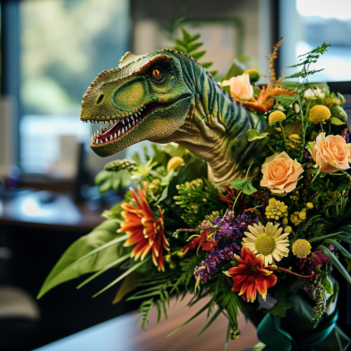 photorealistic gift bouquet that is dinosaur themed, realistic office background --v 6.0
