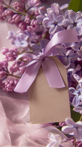 gift tag on a silk ribbon, no inscription, a bouquet of lilacs tied with a ribbon, focus on the tag, tag close-up, macro photography, Nikon macro lens, advertising photo, clear image --ar 9:16 --v 6.0