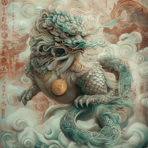 A Pi Xiu in photorealistic style, holding a gold coin in its claws, jade-like scales and fur texture so fine it appears lifelike, set against a misty background of swirling clouds and ancient Chinese symbols. Precision ink-inspired outlines, vibrant realistic colors, cinematic lighting --v 6.1 --s 50