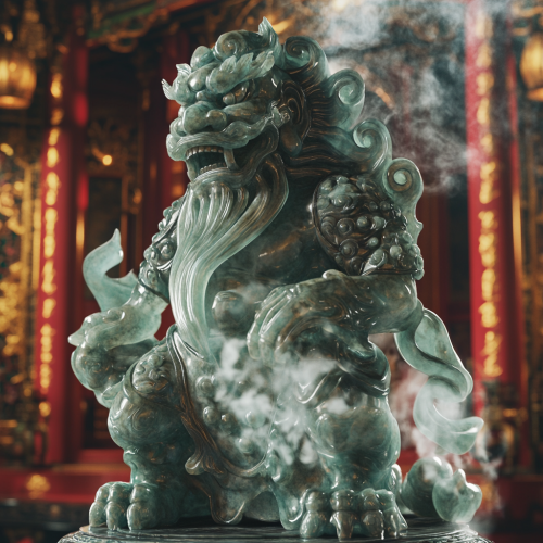 A realistic sculpture of a Pi Xiu, detailed in jade with intricate carvings, majestic stance, viewed in close-up against a traditional Chinese temple background. The temple features red and gold accents with incense smoke drifting in the air, soft ambient lighting casting gentle shadows --v 6.1 --s 50
