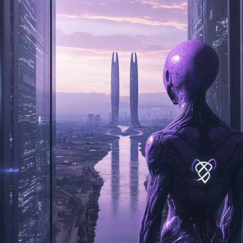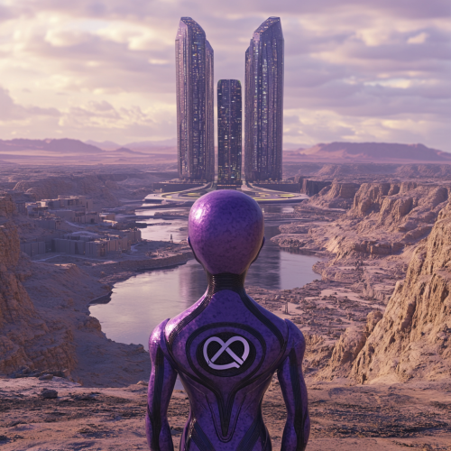 purple alien standing back facing looking at long view of two rivers merging into one river leading to a large high tech building with infinity symbol