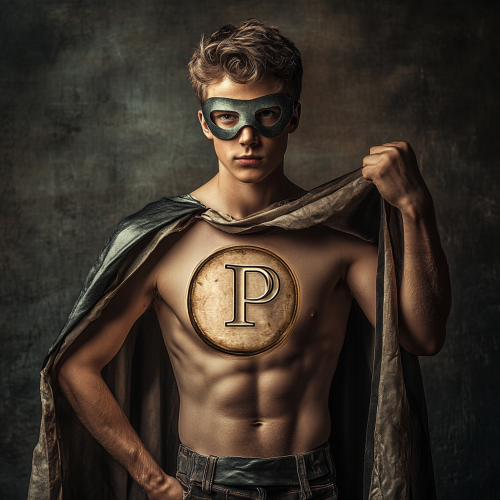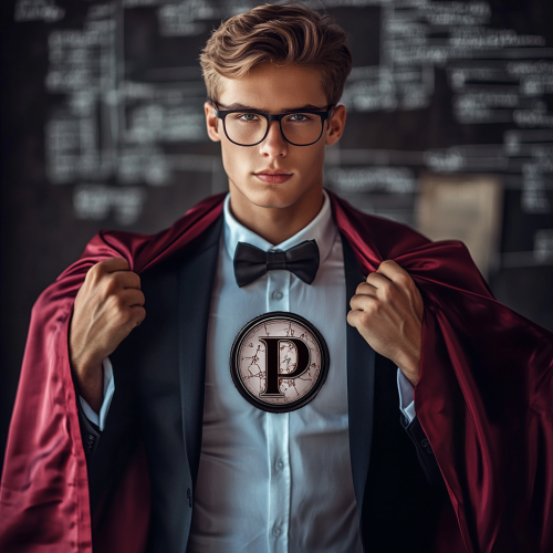The photo of superhero college boy, dressed in his costume that has number Pi, greek alphabet letter, representing his super intelligent power. Realistic photo, not drawing or comic
