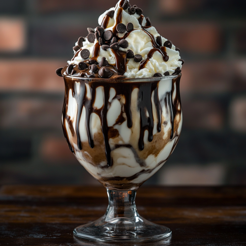 The Dirty Snowman Cocktail is a decadent, dessert-like drink featuring a rich mix of hot chocolate and ice cream. It's served in a glass coated with drizzles of chocolate syrup, creating a visually appealing, messy effect that enhances the indulgence. Inside, creamy hot chocolate is blended with scoops of ice cream, creating a thick, frosty base. The drink is topped with a generous swirl of whipped cream, sprinkled with chocolate chips for added texture and flavor. This cocktail is perfect for a cozy winter treat, offering a mix of cold, creamy textures and rich chocolatey warmth, photo taken by iphone 15 pro, --ar 1:1