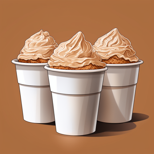 brown kraft paper pints of hard ice cream, all with lids, stacked in a pyramid on a white marble counter with a dark background, lit from the side, pints are plain in color without texture, hyperrealistic cartoon style