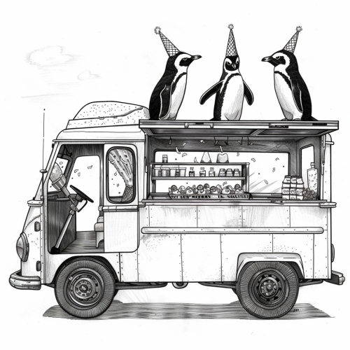 a big and fancy ice cream truck operated by penguins, flat, 2d, drawing, black and white