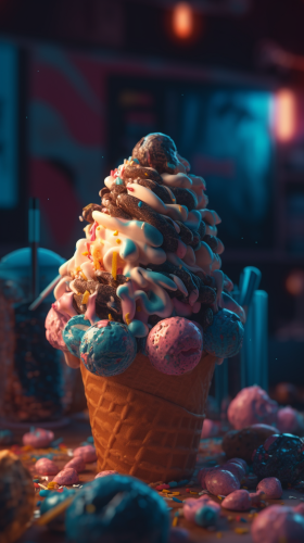 ice cream photography, photorealistic, Unreal Engine 5, Cinematic, Ultra-Wide Angle, Depth of Field, hyper-detailed, insane details, neon blue intricate details, beautifully color graded, Unreal Engine, Cinematic, Photoshoot, Shot on 25mm lens, Depth of Field, DOF, Tilt Blur, Shutter Speed 1/1000, F/22, White Balance, 32k, Super-Resolution, Megapixel, Pro Photo RGB, VR, Lonely, Good, Massive, Half rear Lighting, Backlight, Natural Lighting, Incandescent, Optical Fiber, Moody Lighting, Cinematic Lighting, Studio Lighting, Soft Lighting, Volumetric, Beautiful Lighting, Accent Lighting, Global Illumination, Screen Space Global Illumination, Ray Tracing Global Illumination, Optics, Scattering, Glowing, Shadows, Rough, Shimmering, Ray Tracing Reflections, Lumen Reflections, Screen Space Reflections, Diffraction Grading, Chromatic Aberration, GB Displacement, Scan Lines, Ray Traced, Ray Tracing Ambient Occlusion, Anti-Aliasing, FKAA, TXAA, RTX, SSAO, Shaders, OpenGL-Shaders, GLSL-Shaders, Post Processing, Post-Production, Cell Shading, Tone Mapping, CGI, VFX, SFX, insanely detailed and intricate, hyper maximalist, elegant, super detailed, dynamic pose, photography, volumetric, ultra-detailed, intricate details, 8K, super detailed, ambient occlusion, volumetric lighting, high contrast, Hdr, --ar 9:16 --v 5.0