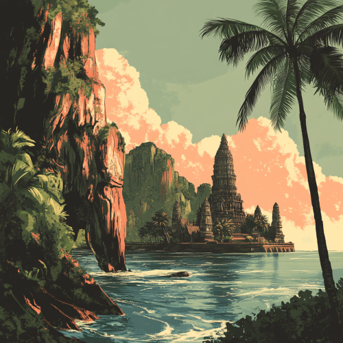 Make me an artwork inspired by Thai Landscape and monument in a retro style with some cliff like in Koh phiphi, temple, palm tree and a bit of water, it have to be with a good graphic and moody color the style maybe retro ambient
