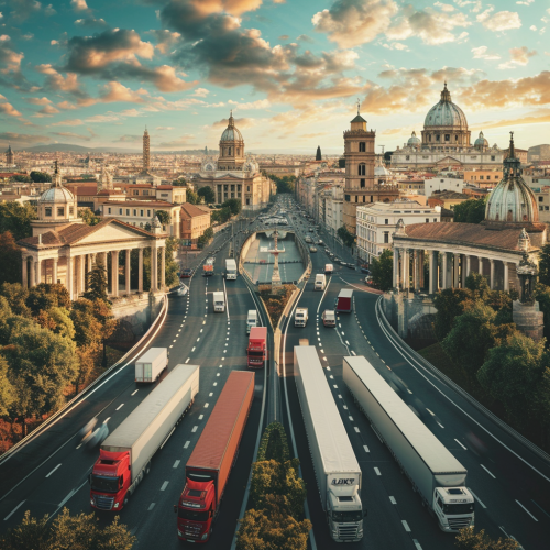 a photorealistic image depicting a highway surrounded by the most iconic monuments of Europe, with trucks driving thorough as an illustration of freight as the economic backbone of our european society --v 6.0