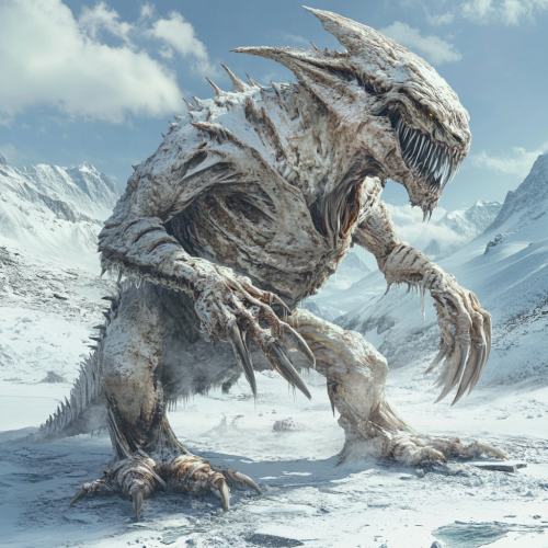 Frostlurks are gargantuan, bipedal monstrosities. They have long and lithe bodies. They are land based and often seen in frozen mountainous wastelands. The have thick and impenetrabletranslucent scales. Their head is fishlike with eyes that look like a spiders. Their hands are like eagle talons. They have long, fish like teeth. They have frills on the side and top of their head. And you can see the cold radiate off them.