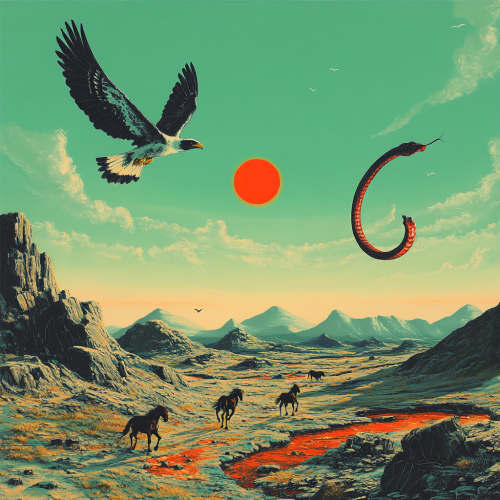 a secret that nobody knows in a clear sky with no clouds. the horizon is far away. the sun rises and set simultaneously in both directions. a single black and white hawk with a red belly flies in the distance. there are horses that run in the foreground from a snake the size of the empire state building. this is on an alien planet with hilltops of green.