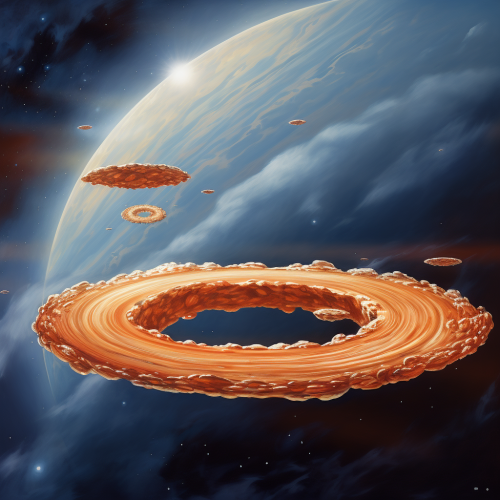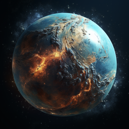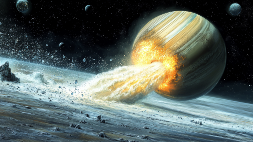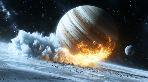 view from space a large icy gas planet is impacted by a medium rocky planet approximately half it's size, a plume of ice sprays from the edges of the impact area, photorealistic, --ar 16:9