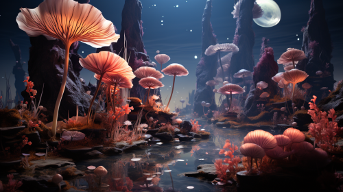 various plants, mushrooms and rocks is placed on the paper, in the style of futuristic spacescapes, light aquamarine and indigo, site-specific artworks, made of crystals, rendered in cinema4d, vibrant color palette, snow scenes --ar 16:9 --v 5.2 --s 750