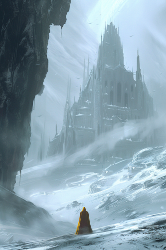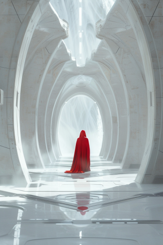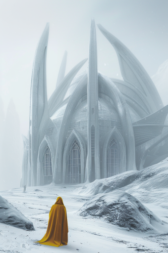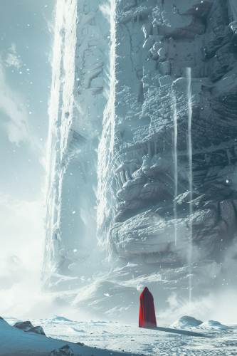 Design a scene on the a frozen ice planet, featuring a solitary figure in a flowing red robe standing before an immense, futuristic architecture that pierces the sky. This white edifice should be adorned with minimal and smooth curve, futuristic form and is covered in white fog. In the foreground, the back of a figure wearing a red robe is depicted. Aim for a cinematic composition that could be a still from an epic science fiction film, evoking a sense of mystery and grand scale. --ar 2:3 --v 6.0