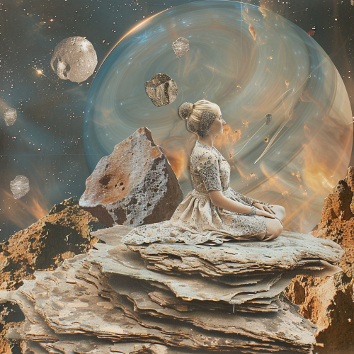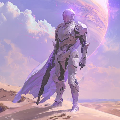 a futuristic warrior, biocybernetic armor of light purple color, desert setting with a giant planet in the sky, cartoon style
