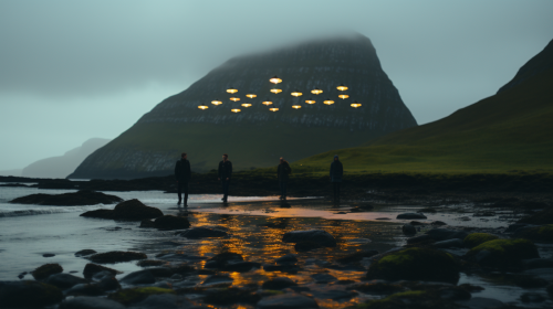 Sci fi Highly detailed stunning photograph of five people in futuristic spacesuits standing next to a spaceship watching three suns rising on an alien planet covered with icy oceans with rocky islands covered in vivid luminescent lichens and ancient hindu temple, cinematography, cinematic lighting, rim lighting, caustics, subsurface scattering, color pops --v 5.2 --style raw --s 1000 --c 100 --weird .25 --ar 16:9