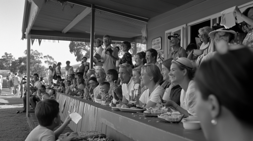 film still, black and white, community cricket crowd on the sidelines in the pavilion at a local game, someone barbecuing, someone has cucumber sandwiches, there's kids, people of all ages and demographics, blue bunting, people holding up signs, cheering, wide shot, realistic, like a documentary about an australian local cricket club --ar 16:9 --v 6.1