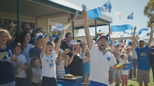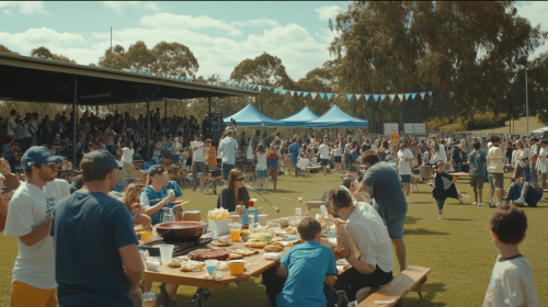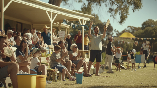 film still, community cricket crowd on the sidelines in the pavilion at a local game, someone barbecuing, someone has cucumber sandwiches, there's kids, people of all ages and demographics, blue bunting, people holding up signs, cheering, wide shot, realistic, like a documentary about an australian local cricket club --ar 16:9