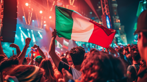 A vibrant festival crowd with people dancing and enjoying the music. In the middle of the crowd, someone is sitting elevated, holding the Italian flag high above their head. The flag is clearly visible, its green, white, and red colors standing out against the crowd. The scene is lively, filled with colorful lights and a warm atmosphere, capturing the energy and excitement of a music festival. The background shows a stage with neon lights, adding to the immersive experience. --ar 16:9 --v 6.0 --style raw