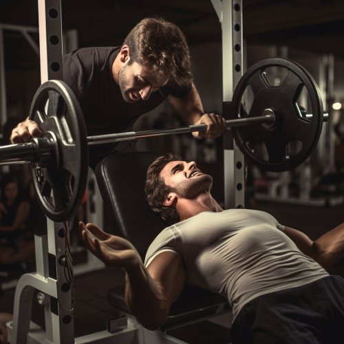 a guy doing bench press, someone spotting him making sure he doesn't drop the bar
