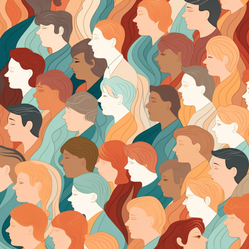 Big crowd pattern. seamless texture of different people group, only male with various hairstyles, profile heads, lots of colors