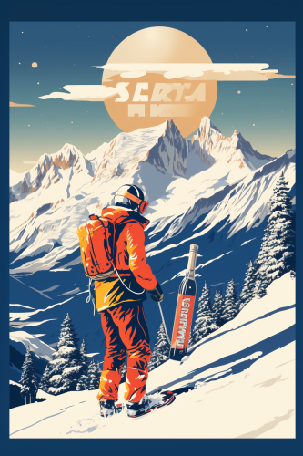 poster in the style of charlie adams, someone skiing in the mountains, someone drinking a beer in the foreground wearing a ski outfit --ar 2:3