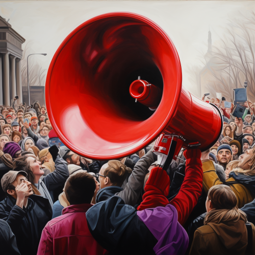 A Renaissance painting of an iconic Eva Duarte Peron wearing an elegant suit giving her speech at the podium in front of people, she is pointing to something on stage with one hand while speaking into a microphone held up by someone beside here. She has blonde hair pulled back tight behind her ears. In background we see blurred out-of-focus images of a few people