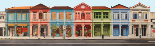 hiperealistic exhibition about concept, with infographic plans and elevations, using peranakan street colours and architecture all focusing on the paintings and style of Lim Tze Peng's paintings --ar 10:3