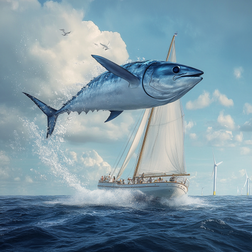 photorealistic To combine the dynamic image of a bluefin tuna jumping above a sailing boat with the business values of Equinor--especially collaboration--we can emphasize the synergy between nature and human activity. In this case, the fish and boat represent harmony between marine life and industry, while collaboration can be symbolized by how both elements coexist. Here are a few ideas to incorporate Equinor's value of collaboration into the imagery: 1.Symbolic Interaction**: Show the sailing boat and the bluefin tuna interacting in a way that suggests mutual respect and harmony, representing the collaborative spirit between nature and human innovation. The boat could be slightly closer to the tuna, and the water splash could also gently connect to the boat. 2.Teamwork Elements**: The boat could have a small crew working together, hoisting the sails, symbolizing teamwork. The fish could be leaping in such a way that it guides or complements the boat’s movement. 3.Energy & Innovation**: Add a subtle hint of renewable energy by incorporating wind turbines in the background or sails that resemble Equinor's logo, symbolizing innovation and a sustainable future, which are core to the company’s mission. The boat and fish work together in harmony to show how collaboration in energy can benefit both nature and society. Would you like me to generate an image with these elements?