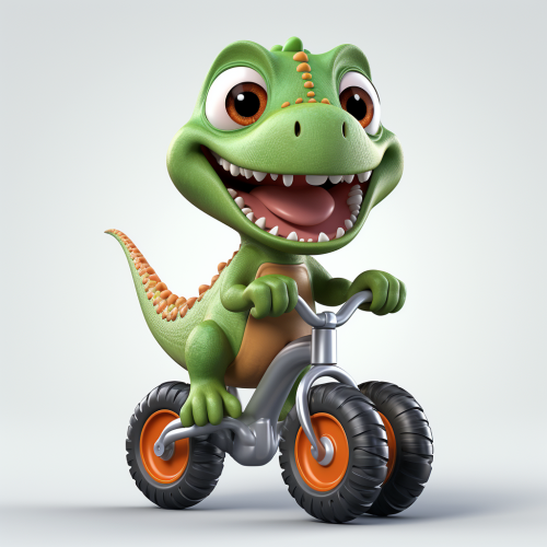 Colorful side bike with big tires, clay animation, cute facial expression, green baby dinosaur with big eyes (tyrannosaurus), cute baby dinosaur, laughing with mouth open, white background, side bike with big tires, cute mini baby dinosaur, --v 5.2