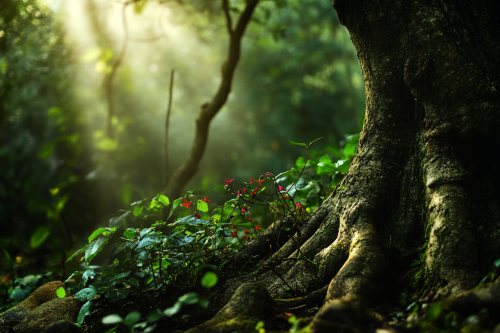 Real photos in the Asian forest, taken in a moist forest, macro photography, wild flowers, big tree scene, golden light, sharp and realistic images, excellent details, realistic --ar 3:2