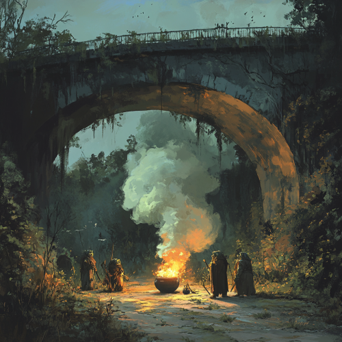 A nighttime scene: an overgrown road under a bridge, with a huge smoking cauldron over a fire. A group of Talkin style giant trolls are standing around the fire. Beneath the bridge, there is a dark cave.