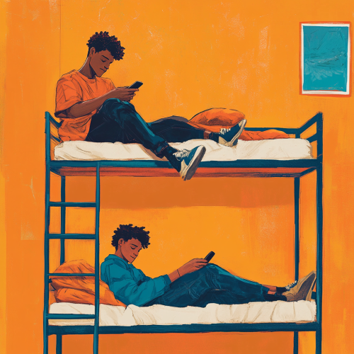 an illustrated book cover with an orange background featuring two college boys on a bunk bed. The boy on the top level is sitting on his phone, the boy on the bottom bunk bed is lying down.