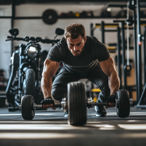 Create a realistic image of a motorcyclist performing strength exercises at a gym. The motorcyclist should be focused and engaged in a workout routine that emphasizes core strength and upper body strength. In the background, include motorcycle gear and a motorcycle to highlight the connection between exercise and riding skills. The scene should convey the importance of regular exercise for improving motorcycle handling and overall riding performance.