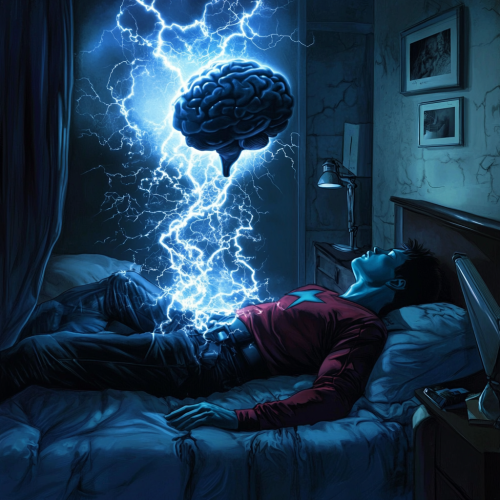 A photo of a superhero like those from the TV series The Boys, whose power is sleeping. I want him to be depicted asleep in his college dorm room, and brain waves occupy the bedroom.