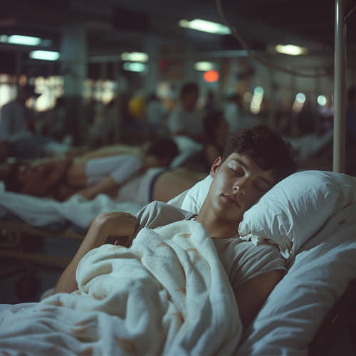 man asleep in bed, bed is in the middle of busy crowded gym setting, high angle shot, ar 9:16 --v 6.0 --s 750
