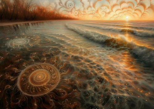 surreal, detailed illustration of fractals coming down from the sky to the ground, highly detailed, beach, dawn, swirling fractal patterns, bright Rembrandt palette, --ar 7:5 --c 10 --v 6.0 --weird 50