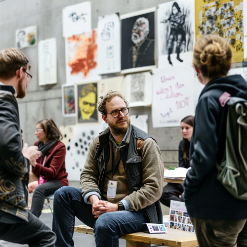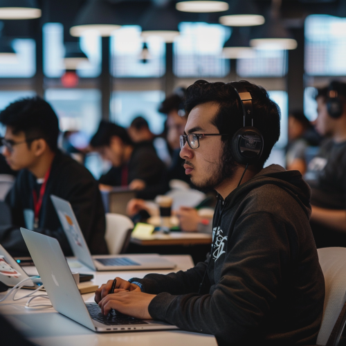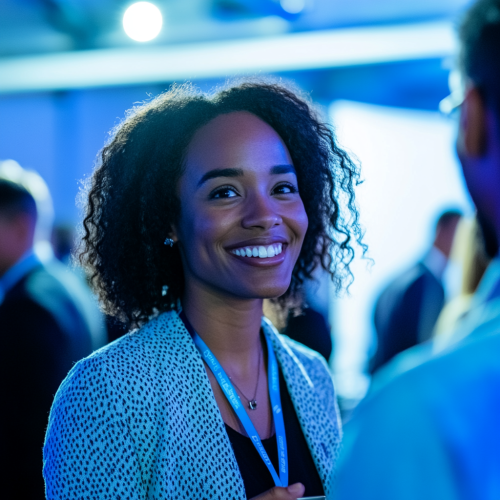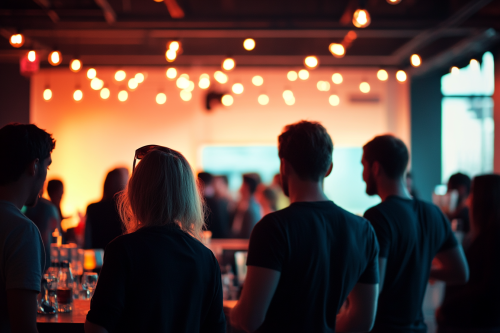 A lively tech event or networking session with young professionals mingling, exchanging ideas, and collaborating on projects, highlighting the community engagement aspect. --ar 3:2