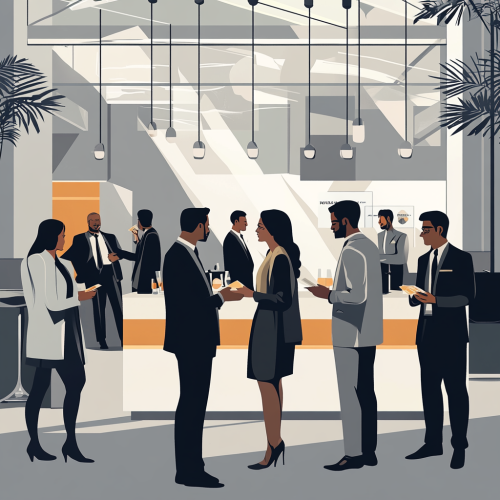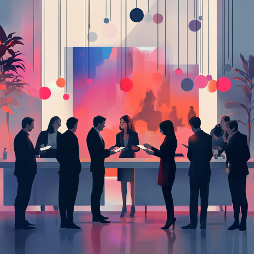 Generate a digital art for A digital art scene of professionals networking at an industry event, engaging in conversations and exchanging business cards. The background is a modern conference hall with a lively atmosphere. Use light gray as the primary color for the background elements. --ar 1:1