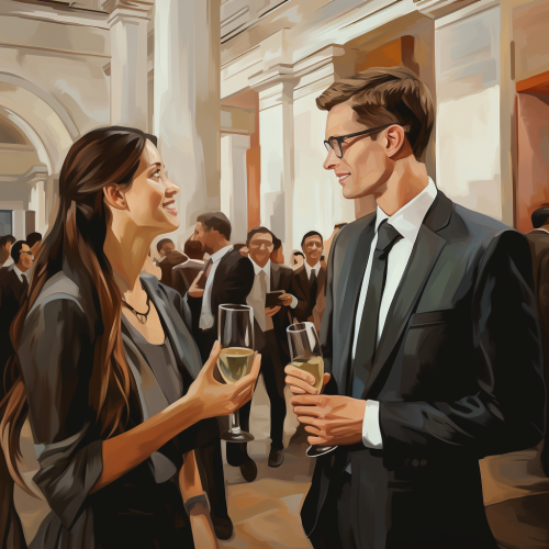 a likeable pair of lawyers. One man. One woman. Chatting with other people at a recruiting event. flat art