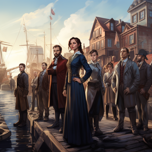 Propaganda Picture of a diverse community of female and male founders standing in a harbour in a small hanseatic town at the baltic sea. Dramatic blue colors