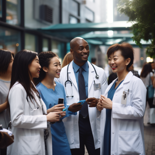 healthcare stafffing networking events in a nice urban area with african american people and asian people