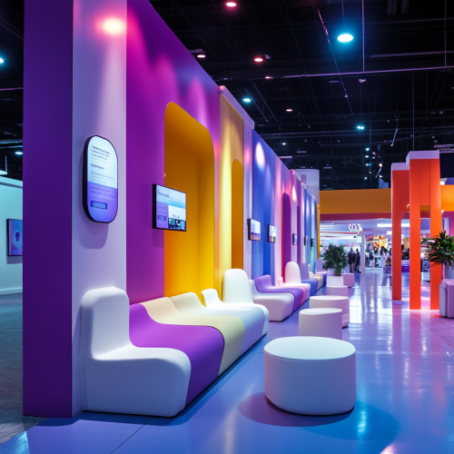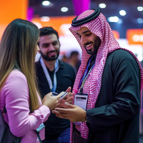 A zone in an entertainment exhibition called: Tech-Enhanced Networking: Smart Badges: Use RFID or NFC-enabled badges that allow attendees to exchange contact information and track interactions seamlessly. The zone theme should be characterized by a vibrant color palette, including fuchsia, blue, yellow, purple, and white, to enhance the visual impact and overall atmosphere. The zone should include Saudi people.