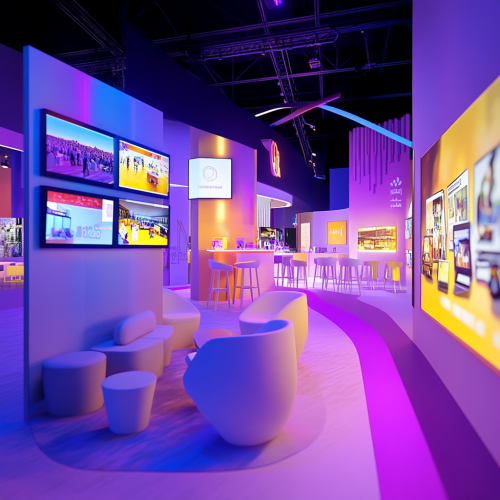 A zone in an entertainment exhibition called: Tech-Enhanced Networking: Virtual Networking Lounges: Create virtual spaces where remote attendees can engage in networking activities with on-site participants. The zone theme should be characterized by a vibrant color palette, including fuchsia, blue, yellow, purple, and white, to enhance the visual impact and overall atmosphere. The zone should include Saudi people.