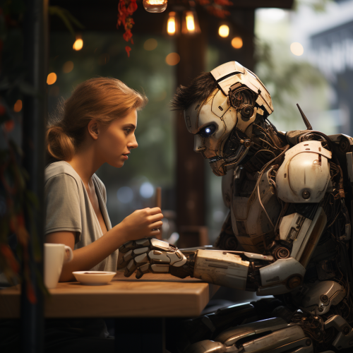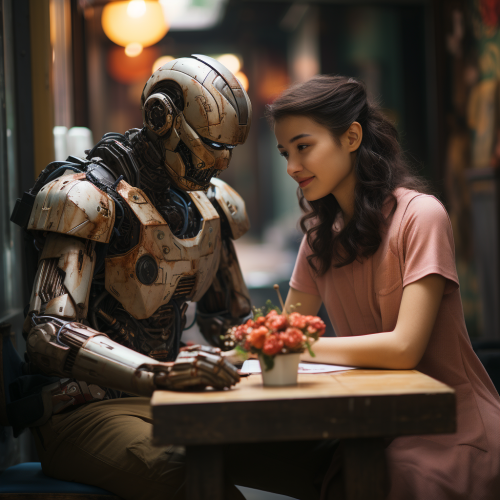 man on a date with a robot woman, photorealistic, cinematic --s 750