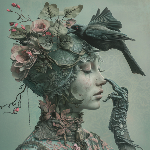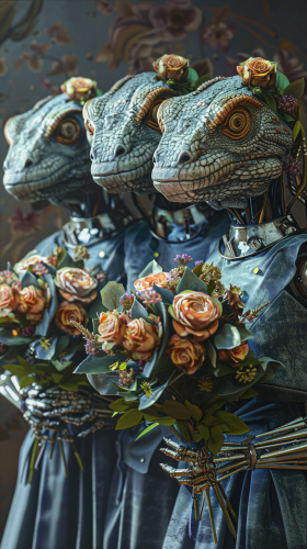 Create a photorealistic image of three female human-robot hybrid beings with Komodo dragon faces, holding bouquets for International Women's Day. Highlight the blend of organic and mechanical textures, with dramatic lighting. --ar 9:16 --v 6.0