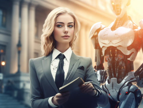 8K resolution, high-quality sci-fi movie still. A sleek, futuristic robot working gracefully in a spacious, comfortable environment. In the background, human employees are also working, but it's evident that the robot's efficiency far surpasses that of the humans. ar 16:9