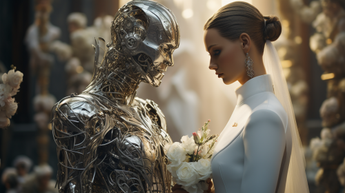 The wedding of anandroid robot and a woman in the style of futuristic, vray tracing, white and silver, uhd image --ar 16:9 --stylize 250 --v 5.2