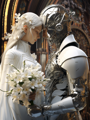The wedding of an intelligent man and a human, in the style of futuristic glamour, vray tracing, white and silver, masamune shirow, circuitry, fra angelico, uhd image --ar 3:4 --stylize 250 --v 5.2