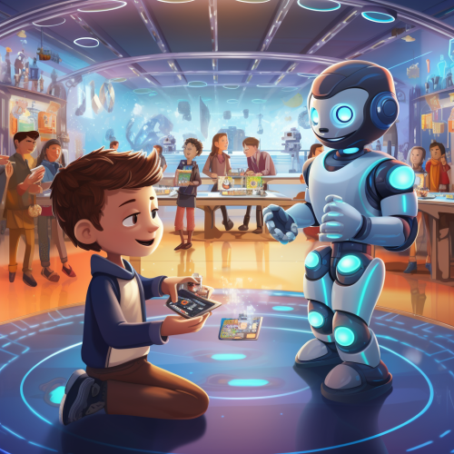 Illustrate a futuristic facility with cartoon robot characters interacting with human characters. Showcase various interactions like working together, playing sports, and relaxing in a park. Storyboarding. gaming facility which integrated AI for children who are creating, choosing and playing games