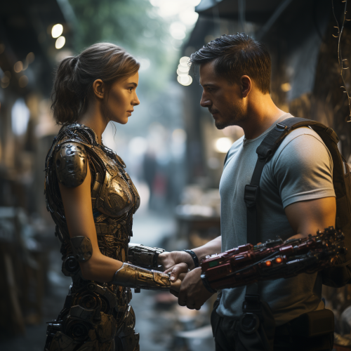 man holding hands with a robot woman, photorealistic, cinematic --s 750